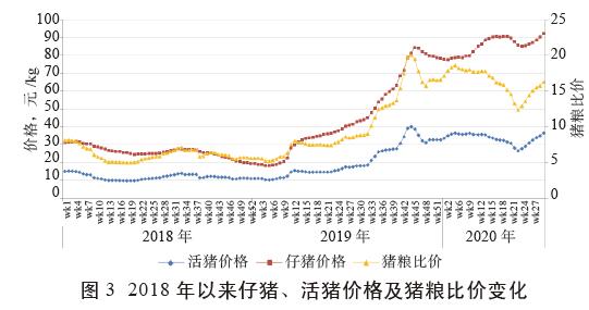 如圖3所示,2020年以來,河南省豬糧比價從1月22日的最高峰18.6:1逐步下降到5月20日的最低谷12.4:1;5月下旬以來,活豬價格持續(xù)上漲,7月8日豬糧比價回升到16.29:1,出欄1頭育肥豬可盈利2500元左右。