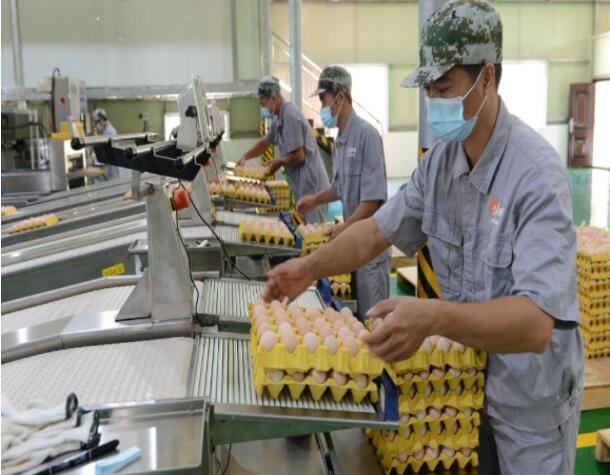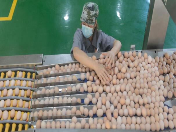 ↑工人在生產(chǎn)線上整理雞蛋
