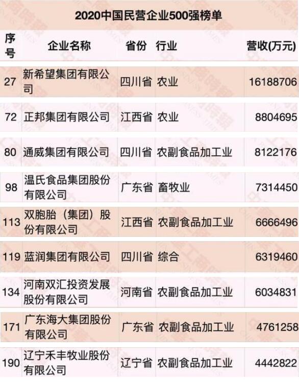 根據(jù)榜單,畜牧相關(guān)類企業(yè)中有13家企業(yè)上榜,分別是:新希望集團(tuán)、正邦集團(tuán)、通威集團(tuán)、溫氏食品、雙胞胎、藍(lán)潤集團(tuán)、雙匯發(fā)展、廣東海大、遼寧禾豐、山東新希望六和、福建圣農(nóng)、牧原實(shí)業(yè)。