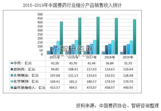 2018-2019年,由于生豬市場(chǎng)的需求降低,行業(yè)的規(guī)模有一定程度下滑,經(jīng)濟(jì)效益也有較為明顯的下降。2018年我國獸藥行業(yè)的銷售收入從2017年的473.07億元下降至了458.97億元,2019年下降至了440.95億元。其中生物制品總體穩(wěn)定,受影響較小,化學(xué)制劑下降明顯。