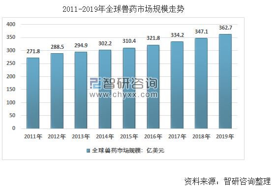 獸藥工業(yè)是20世紀(jì)中葉迅速崛起和發(fā)展的產(chǎn)業(yè)。經(jīng)過多年的發(fā)展,獸藥行業(yè)對(duì)畜牧業(yè)預(yù)防、治療和控制各類動(dòng)物疫病發(fā)揮了重要作用,為人類安全和食品供應(yīng)的可持續(xù)提供了堅(jiān)實(shí)的保障。經(jīng)過多年的發(fā)展,國外獸藥市場(chǎng)已進(jìn)入穩(wěn)步發(fā)展時(shí)期。近年來,在全球人口的持續(xù)增長(zhǎng)和食品需求的推動(dòng)下,全球獸藥行業(yè)市場(chǎng)規(guī)模穩(wěn)步擴(kuò)大,2019年全球獸藥市場(chǎng)規(guī)模達(dá)到362.7億美元。