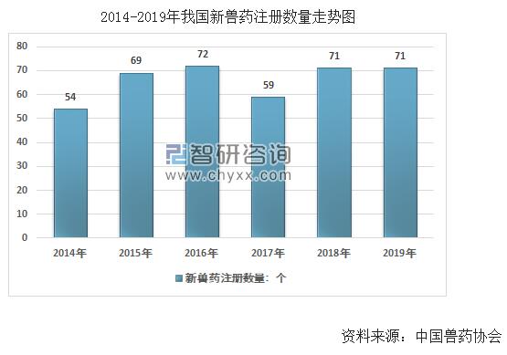 我國獸藥工業(yè)起步晚于歐美等發(fā)達(dá)國家,自上世紀(jì)90年代以來,水產(chǎn)養(yǎng)殖業(yè)的發(fā)展帶動(dòng)了獸藥工業(yè)的快速增長(zhǎng)。2006年以來,隨著獸藥GMP、獸藥GSP等法律法規(guī)的實(shí)施,獸藥行業(yè)的生產(chǎn)經(jīng)營逐步規(guī)范,產(chǎn)品質(zhì)量大幅度提高。從2014-2019年中國新獸藥的注冊(cè)數(shù)量情況開始,中國新獸藥數(shù)量出現(xiàn)波動(dòng),2017年明顯下降,但2018年大幅增加,達(dá)到71種。2019年數(shù)量與上年相同。