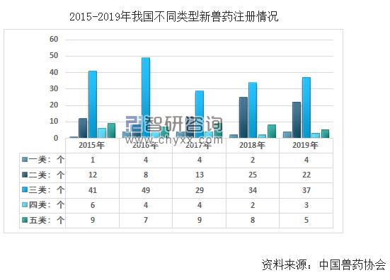 智研咨詢發(fā)布的《2020-2026年中國動(dòng)物保健品行業(yè)發(fā)展前景與投資規(guī)劃分析報(bào)告》指出:獸藥的分類方面,由于獸藥品種繁多,根據(jù)不同的分類方法可以分為不同的品種。一方面,根據(jù)現(xiàn)行的獸藥管理辦法,我國獸藥可分為五類,即一、二、三、四、五類。2019年,中國注冊(cè)數(shù)量最多的新獸藥是二類和三類,分別為22種和37種。這兩種藥物的共同點(diǎn)是,我國開發(fā)的原料及其制劑已獲準(zhǔn)在國外生產(chǎn),但未列入國家藥典、獸藥或國家法定藥品標(biāo)準(zhǔn)。此外,四類藥物最少,只有3種。