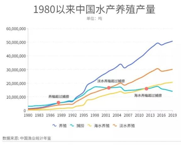近年來,中國(guó)漁業(yè)高速發(fā)展,水產(chǎn)品產(chǎn)量連續(xù)30余年居世界第一。我國(guó)早在1988年就實(shí)現(xiàn)了養(yǎng)殖總產(chǎn)量超過捕撈總產(chǎn)量,成為了世界上唯一一個(gè)養(yǎng)殖總產(chǎn)量超過捕撈總產(chǎn)量的國(guó)家。2002年和2012年分別實(shí)現(xiàn)了淡水養(yǎng)殖產(chǎn)量和海水養(yǎng)殖產(chǎn)量超過捕撈總產(chǎn)量。