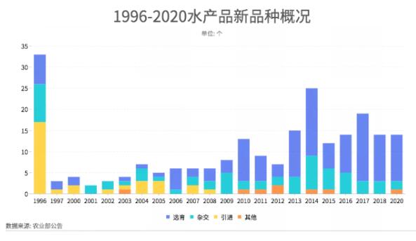 近年來農(nóng)業(yè)部和科技部都對(duì)水產(chǎn)育種表現(xiàn)出極大重視,截至2020年,農(nóng)業(yè)部公告的水產(chǎn)新品種有229個(gè)。早年間引進(jìn)種較多,2009年之后國(guó)家就沒有審定新的引進(jìn)種了。近年來,選育種占據(jù)較大比例,截至2020年,選育種新品種累計(jì)126個(gè),雜交種64個(gè),引進(jìn)種31個(gè),其他8個(gè)(指通過細(xì)胞工程育種技術(shù)和分子育種技術(shù)得到的新品種)。目前的水產(chǎn)新品種的育種方向集中于增強(qiáng)抗病能力、提高生長(zhǎng)速度、調(diào)節(jié)性別比例、改善肉質(zhì)和重要經(jīng)濟(jì)性狀、增強(qiáng)對(duì)極端環(huán)境的適應(yīng)能力等。