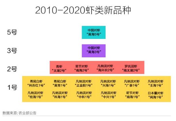 近年來,中國(guó)加大蝦類品種育種力度,自主培育了凡納濱對(duì)蝦“興海1號(hào)”等新品種,新種的成活率和抗病力大大提高,競(jìng)爭(zhēng)力明顯增強(qiáng)。中國(guó)對(duì)蝦育種工作盡管取得重大成果,但由于后續(xù)的保種、擴(kuò)繁、示范和宣傳沒有跟上,新品種蝦苗市場(chǎng)占有率僅為2%~5%[6]。從命名上來看,新品種育種大多還是起步階段,代際連續(xù)性不強(qiáng),主要是1號(hào)、2號(hào)苗,只有中國(guó)對(duì)蝦“黃海”系列持續(xù)選育,已經(jīng)有了“黃海5號(hào)”。對(duì)比全球第一的美國(guó)對(duì)蝦改良系統(tǒng)有限公司每年選育60~70次,我國(guó)的對(duì)蝦育種之路還很漫長(zhǎng)。