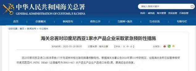據(jù)海關(guān)總署官方網(wǎng)站18日消息,因從印度尼西亞進(jìn)口1批凍帶魚1個(gè)外包裝樣本檢出新冠病毒核酸陽性,根據(jù)海關(guān)總署公告2020年第103號(hào)的規(guī)定,全國海關(guān)自即日起暫停接受印度尼西亞PT.PUTRI INDAH(注冊(cè)編號(hào)為CR010-02)水產(chǎn)品生產(chǎn)企業(yè)產(chǎn)品進(jìn)口申報(bào)1周,期滿后自動(dòng)恢復(fù)。