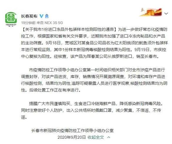 9月20日,長春市委網(wǎng)絡(luò)安全和信息化委員會(huì)辦公室發(fā)布通報(bào)稱,9月18日,長春市寬城區(qū)對某食品公司品名為紅太陽俄須的魷魚須外包裝樣本進(jìn)行常規(guī)監(jiān)測,其中1份樣本新冠病毒核酸檢測結(jié)果為陽性。9月19日,長春市疾控中心復(fù)核為陽性。經(jīng)核查,該產(chǎn)品為琿春某公司從俄羅斯進(jìn)口,銷至長春市。