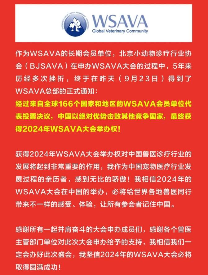 經(jīng)過來自全球166個(gè)國家和地區(qū)的 WSAVA會(huì)員單位代表投票決議,中國以絕對(duì)優(yōu)勢擊敗其他競爭國家,最終獲得2024年WSAVA大會(huì)舉辦權(quán)。