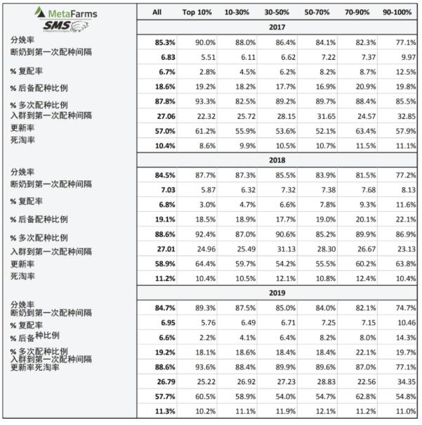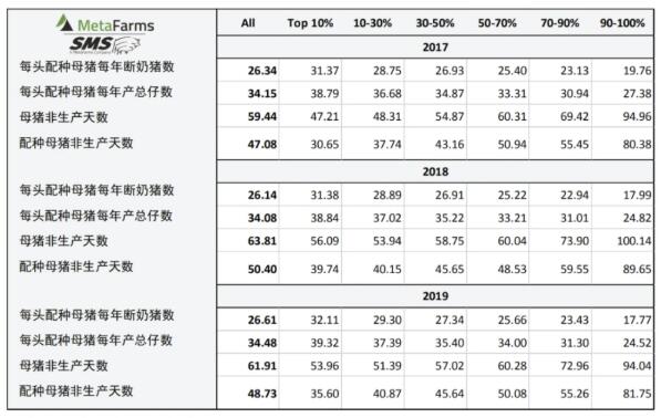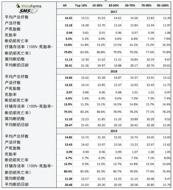 該報(bào)告由美國(guó)養(yǎng)豬數(shù)據(jù)公司MetaFarms及子公司SMS具體制作,所用數(shù)據(jù)為其系統(tǒng)中至少建檔3年以上的美國(guó)豬場(chǎng)的數(shù)據(jù),2019年該數(shù)據(jù)集涵蓋母豬場(chǎng)600個(gè),母豬1,588,246頭,保育豬15,666,136頭,育肥豬17,479,763頭,斷奶到育肥豬8,023,610頭。