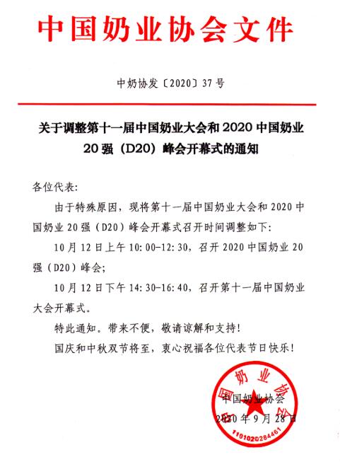 關于調整第十一屆中國奶業(yè)大會和2020中國奶業(yè)20強(D20)峰會開幕式的通知