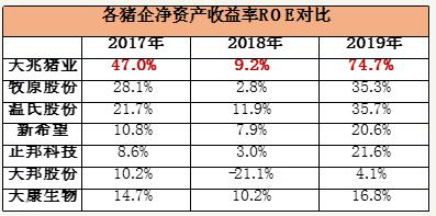 最后來(lái)看綜合反映企業(yè)運(yùn)營(yíng)能力的核心指標(biāo)—凈資產(chǎn)收益率ROE。2017年,天兆豬業(yè)高達(dá)47.0%,位于行業(yè)第一,扣除公允價(jià)值變動(dòng)的影響為45.6%,依然為行業(yè)第一。2018年豬周期低點(diǎn),天兆豬業(yè)以9.2%位于行業(yè)第三,扣除公允價(jià)值變動(dòng)的影響為8.1%,位于行業(yè)第三。2019年天兆豬業(yè)為74.7%,扣除公允價(jià)值變動(dòng)的影響為59.8%,依然為行業(yè)第一。