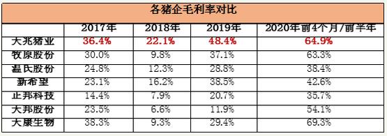 (注:天兆豬業(yè)2020年毛利率為前四個(gè)月數(shù)據(jù),其余公司為2020年上半年)