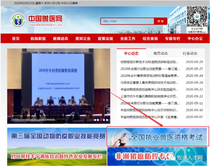 1、登錄中國(guó)獸醫(yī)網(wǎng)(www.cadc.net.cn),點(diǎn)擊全國(guó)執(zhí)業(yè)獸醫(yī)資格考試,進(jìn)入考試平臺(tái)