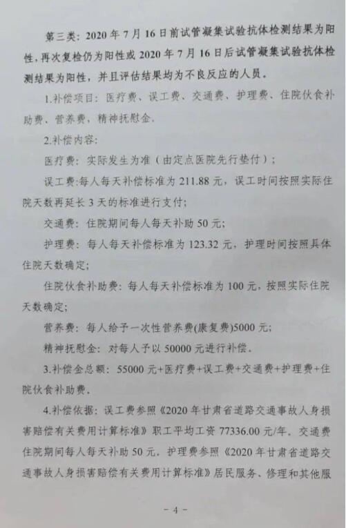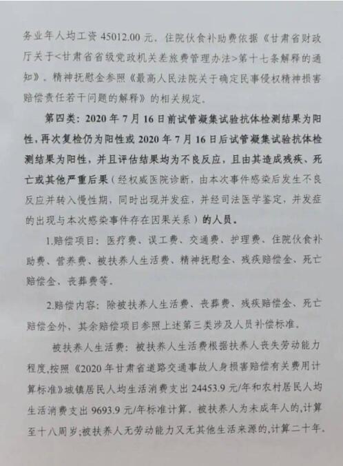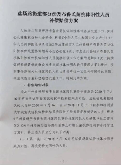 顧雅向澎湃新聞發(fā)來(lái)的《賠償方案》顯示,此次補(bǔ)償賠償?shù)膶?duì)象為:蘭州獸研所布魯氏菌抗體陽(yáng)性事件中涉及的2020年7月16日前首次試管凝集試驗(yàn)抗體檢測(cè)結(jié)果為陽(yáng)性,且經(jīng)省級(jí)復(fù)核確認(rèn)的人員和2020年7月16日至2020年11月30日前參加檢測(cè)后試管凝集試驗(yàn)抗體檢測(cè)結(jié)果為陽(yáng)性并經(jīng)省級(jí)復(fù)核確認(rèn)的人員。