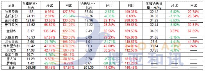 生豬銷(xiāo)量來(lái)看,12家上市企業(yè)生豬銷(xiāo)量同環(huán)比分化,同比多增加,合計(jì)生豬銷(xiāo)量同比增幅繼續(xù)加大,其中牧原股份、正邦科技、天邦股份、金新農(nóng)、天康生物、新希望同比分別增長(zhǎng)超120%。由于生豬市場(chǎng)價(jià)格同比仍較高,生豬銷(xiāo)售收入仍較大幅度增長(zhǎng)。