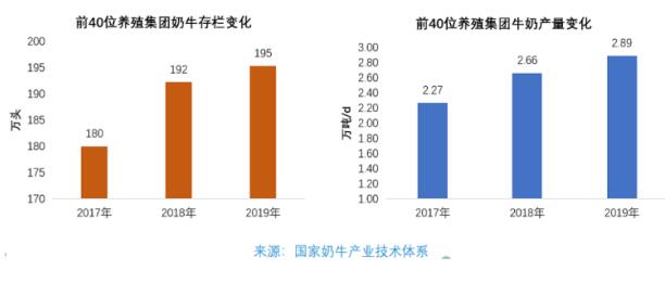 大牧業(yè)集團(tuán)存欄、產(chǎn)量上漲。2017-2019前40位養(yǎng)殖集團(tuán)奶牛存欄增長8.3%,牛奶產(chǎn)量增長27.3%;大牧業(yè)集團(tuán)奶牛存欄2018比2017年增速達(dá)6.7%,2019年比2018年只有1.6%。2019年排名前40位的大型牧業(yè)集團(tuán)約有奶牛存欄195萬頭,中國的萬頭牧場超過80個,這種情況也是世界罕有的。但我們也應(yīng)該反思是否合適,有些地方土地是否配套,周圍的飼料資源是否能滿足生產(chǎn),牛場糞污是否有足夠的土地消納等等。