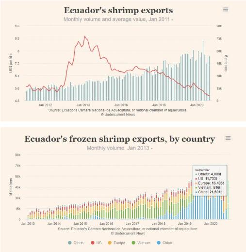 1-9月份,厄瓜多爾向中國出口262,921噸蝦產(chǎn)品,較去年同期增長9%;貨值13.98億美元,較去年同期增長3%。
