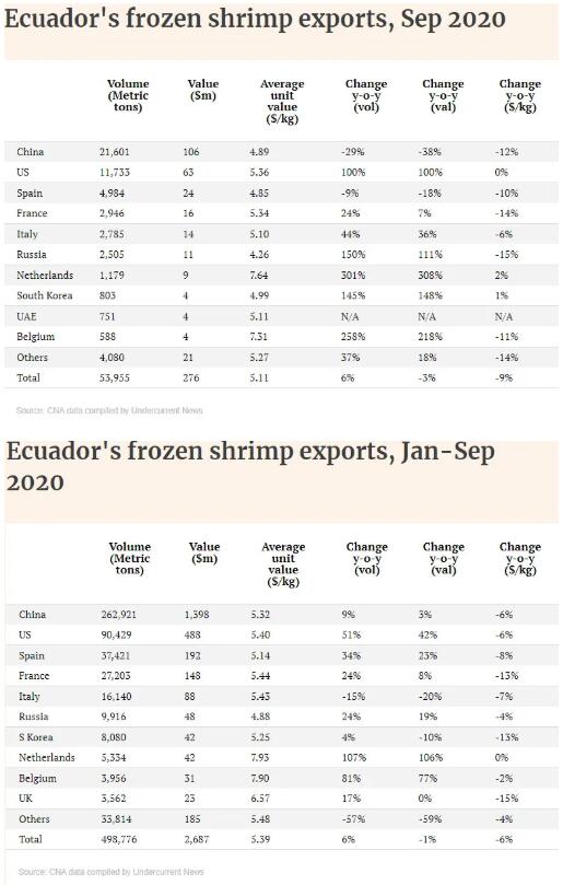 在價(jià)格方面,厄瓜多爾白蝦國際均價(jià)從$5.11/kg(8月份)跌至$5.13/kg,出口中國的均價(jià)反而在上漲,從$4.83/kg(8月份)漲至$4.89/kg。