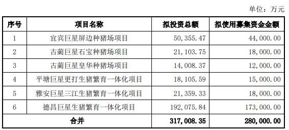 根據(jù)公告,公司本次非公開發(fā)行股票募集資金具體將用于投資建設(shè)宜賓巨星屏邊種豬場項目、古藺巨星石寶種豬場項目、古藺巨星皇華種豬場項目、平塘巨星更打生豬繁育一體化項目、雅安巨星三江生豬繁育一體化項目和德昌巨星生豬繁育一體化項目六個生豬養(yǎng)殖項目。募投項目達產(chǎn)后可新增存欄母豬飼養(yǎng)規(guī)模8.64萬頭,可實現(xiàn)年出欄生豬約220萬頭,將進一步擴大生豬養(yǎng)殖規(guī)模,增強上市公司盈利能力,提高股東回報。