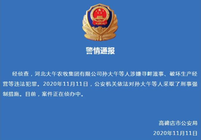 據(jù)“河北公安”微信公眾號(hào)11月11日消息,高碑店市公安局發(fā)布警情通報(bào):經(jīng)偵查,河北大午農(nóng)牧集團(tuán)有限公司孫大午等人涉嫌尋釁滋事、破壞生產(chǎn)經(jīng)營(yíng)等違法犯罪。2020年11月11日,公安機(jī)關(guān)依法對(duì)孫大午等人采取了刑事強(qiáng)制措施。目前,案件正在偵辦中。