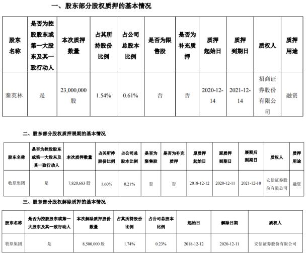 12月15日,牧原股份發(fā)布公告,牧原食品股份有限公司(以下簡稱“公司”)于近日收到公司股東秦英林先生和牧原實業(yè)集團有限公司(以下簡稱“牧原集團”)的通知,獲悉秦英林先生將所持有本公司的部分股權辦理了質(zhì)押手續(xù),牧原集團將所持有本公司的部分股權辦理了質(zhì)押展期、解除質(zhì)押手續(xù)。