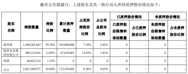 截至本公告日,公司股東秦英林累計質(zhì)押股數(shù)約為1.06億股,占其所持股份比例為7.10%。公司股東牧原實業(yè)集團有限公司累計質(zhì)押股數(shù)約為6767萬股,占其所持股份比例為13.83%。