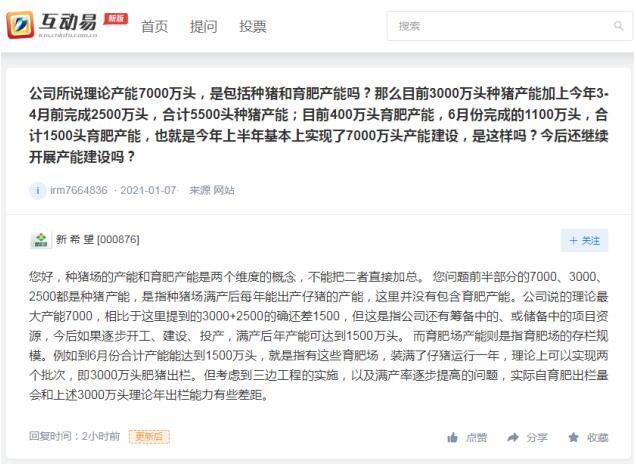 新希望1月12日在回復(fù)投資者提問(wèn)時(shí)表示,種豬場(chǎng)的產(chǎn)能和育肥產(chǎn)能是兩個(gè)維度的概念,不能把二者直接加總。您問(wèn)題前半部分的7000、3000、2500都是種豬產(chǎn)能,是指種豬場(chǎng)滿產(chǎn)后每年能出產(chǎn)仔豬的產(chǎn)能,這里并沒(méi)有包含育肥產(chǎn)能。