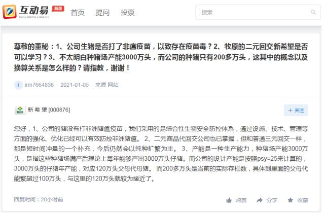 1、公司的豬沒有打非洲豬瘟疫苗,我們采用的是綜合性生物安全防控體系,通過(guò)設(shè)施、技術(shù)、管理等方面的強(qiáng)化、優(yōu)化已經(jīng)可以有效防控非洲豬瘟。