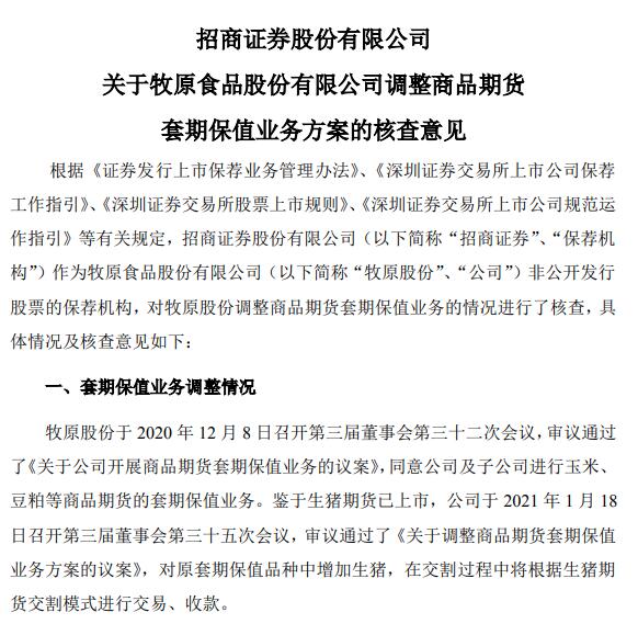 公告稱,公司開展的商品期貨套期保值業(yè)務品種僅限于在中國境內期貨交易所掛牌交易的與公司生產(chǎn)經(jīng)營有直接關系的農(nóng)產(chǎn)品期貨品種,如:玉米、小麥、大豆、豆粕、豆油、生豬等產(chǎn)品。