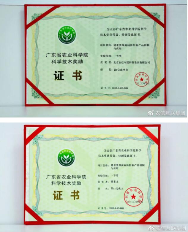 ▲農(nóng)信互聯(lián)“豬重要細(xì)菌病防控新產(chǎn)品創(chuàng)新與應(yīng)用”榮獲“廣東省農(nóng)業(yè)科學(xué)院科學(xué)技術(shù)獎”一等獎