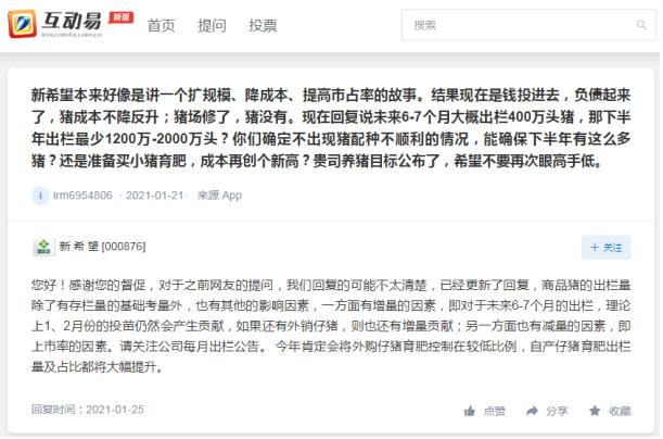 新希望1月25日在回復投資者互動時表示,商品豬的出欄量除了有存欄量的基礎(chǔ)考量外,也有其他的影響因素,一方面有增量的因素,即對于未來6-7個月的出欄,理論上1、2月份的投苗仍然會產(chǎn)生貢獻,如果還有外銷仔豬,則也還有增量貢獻;另一方面也有減量的因素,即上市率的因素。請關(guān)注公司每月出欄公告。