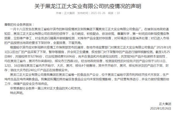 根據哈爾濱市應對新冠肺炎疫情工作指揮部發(fā)布的通報,各地市場監(jiān)管部門對黑龍江正大實業(yè)有限公司食品廠2021年1月1日以后出廠的產品采取了下架、暫存等措施,并會同衛(wèi)生健康、疾控部門對下架暫存的產品進行抽樣核酸檢測。截至1月25日8時,共抽檢樣本92786份,已出檢測結果91696份,尚未在食品和內包裝檢出陽性,共發(fā)現9份產品外包裝樣本呈陽性,均在黑龍江省內,黑河市孫吳縣8份、綏化市蘭西縣1份。經當地政府排查,檢測呈陽性的對應批次的產品分別于1月11日、12日、16日銷往黑龍江省內齊齊哈爾、大慶、黑河、綏化4個銷售地,其中齊齊哈爾、黑河、綏化所涉及的產品已下架、封存;銷往大慶市的240公斤產品正在排查核實中。