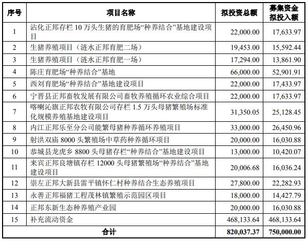 正邦科技稱(chēng),本次發(fā)行募集資金總額為75億元,扣除不含稅發(fā)行費(fèi)用約2150.66萬(wàn)元后,募集資金凈額約74.78億元。募集資金將用于沾化正邦存欄10萬(wàn)頭生豬的育肥場(chǎng)“種養(yǎng)結(jié)合”基地建設(shè)項(xiàng)目、生豬養(yǎng)殖項(xiàng)目(漣水正邦育肥二場(chǎng))、陳莊育肥場(chǎng)“種養(yǎng)結(jié)合”基地等14個(gè)種養(yǎng)項(xiàng)目,并有約46.81億元將用于補(bǔ)充流動(dòng)資金。