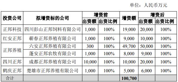 正邦科技1月30日發(fā)布公告,公司及公司子公司紅安正邦、正邦養(yǎng)殖、四川正邦、鶴慶正邦對(duì)6家子公司增資合計(jì)100,700萬(wàn)元。具體情況如下: