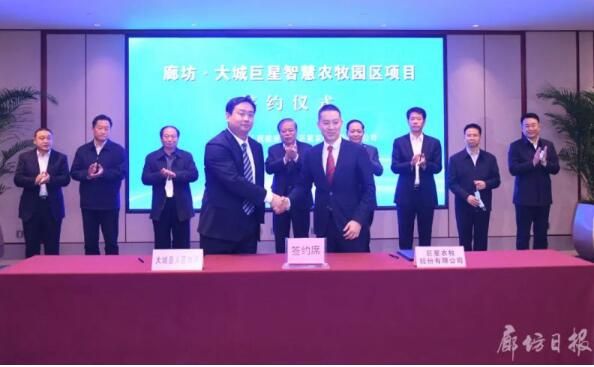 2月3日下午,大城縣與四川巨星集團(tuán)舉行巨星智慧農(nóng)牧園區(qū)項目簽約儀式。據(jù)了解,該項目總投資25億元,占地面積約4000畝。項目將利用一年半到兩年時間,建設(shè)全封閉智慧樓房養(yǎng)豬車間,配套洗消中心、飼料加工車間、有機(jī)肥生產(chǎn)車間、生豬屠宰加工廠,建立糞水回收利用、廢氣凈化處理、智能物聯(lián)網(wǎng)應(yīng)用系統(tǒng)。