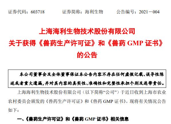 公司表示,公司原《獸藥生產(chǎn)許可證》和《獸藥 GMP 證書》于2021年2月18日到期,根據(jù)《獸藥管理?xiàng)l例》和《獸藥生產(chǎn)質(zhì)量管理規(guī)范》,公司及時(shí)通過了驗(yàn)收并獲取了新的《獸藥生產(chǎn)許可證》和《獸藥 GMP 證書》,新證的及時(shí)取得確保了公司產(chǎn)品的正常生產(chǎn),有利于公司繼續(xù)保持穩(wěn)定的生產(chǎn)能力,滿足市場需求。