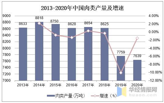我國肉類產(chǎn)量自2019年開始下降幅度加大,2020年全國豬牛羊禽肉產(chǎn)量7639萬噸,比上年減少了120萬噸,同比下降1.54%。