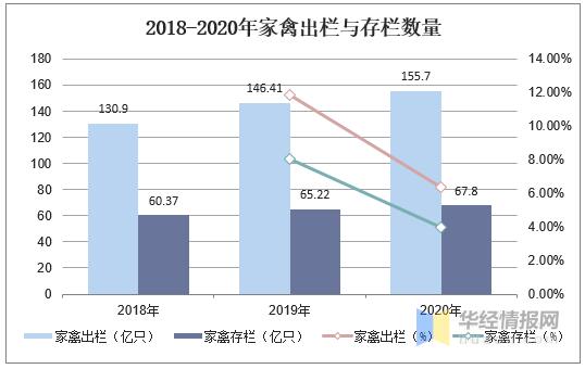 我國家禽生產(chǎn)穩(wěn)定增長,2020年末全國家禽存欄67.8億只,比上年末增加2.6億只,增長3.96%。2020年,全國家禽出欄155.7億只,比上年增加9.3億只,增長6.35%。