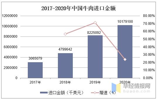 2020年我國牛肉進(jìn)口金額為1017910萬美元,增長速度略低于進(jìn)口數(shù)量,其增長速度為23.76%。