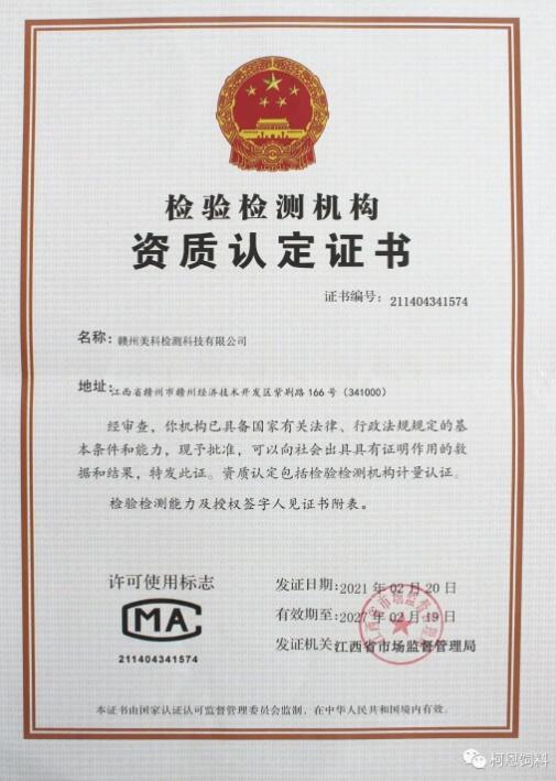 近日,贛州美科檢測科技有限公司(簡稱:贛州美科)榮獲由江西省市場監(jiān)督管理局頒發(fā)的CMA資質(zhì)認(rèn)定證書(證書編號:211404341574),標(biāo)志著集團(tuán)的專業(yè)檢測水準(zhǔn)已達(dá)到國內(nèi)領(lǐng)先水平,為柯恩飼料始終秉承的價(jià)值競爭經(jīng)營理念又注入了新的內(nèi)容。