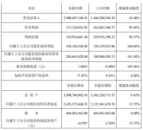3月1日,瑞普生物發(fā)布《2020年度業(yè)績快報》。其中顯示,報告期內(nèi)公司實現(xiàn)營業(yè)收入200,040.71萬元,比上年同期增長36.40%;實現(xiàn)營業(yè)利潤51,312.01萬元,比上年同期增長95.05%;實現(xiàn)利潤總額51,091.67萬元,比上年同期增長96.57%;實現(xiàn)歸屬于上市公司股東的凈利潤39,819.65萬元,比上年同期增長104.88%;實現(xiàn)歸屬于上市公司股東的扣除非經(jīng)常性損益的凈利潤為28,466.56萬元,比上年同期增長約161.48%;基本每股收益為1.0055元,比上年同期增長105.46%。