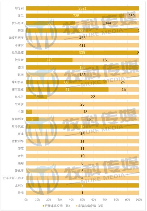 2020年,13個歐洲國家(匈牙利、波蘭、羅馬尼亞、拉脫維亞、俄羅斯、德國、摩爾多瓦、塞爾維亞、烏克蘭、保加利亞、斯洛伐克、比利時、希臘)、9個亞洲國家(韓國、印度尼西亞、菲律賓、越南、東帝汶、中國、印度、老撾、緬甸)、3個非洲國家(南非、塞拉利昂、贊比亞)、1個大洋洲國家(巴布亞新幾內(nèi)亞)報告了非洲豬瘟疫情。其中,匈牙利共報告了3821起非洲豬瘟疫情,居首位。