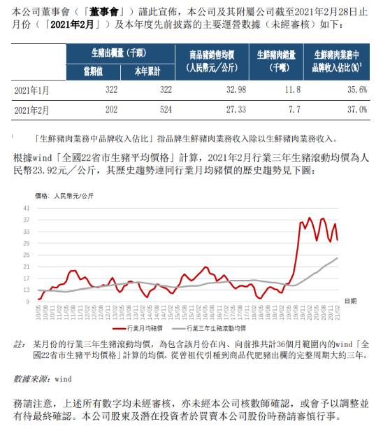 中糧家佳康3月8日公布2021年2月運(yùn)營(yíng)快報(bào)。公司2月份銷(xiāo)售生豬20.2萬(wàn)頭,環(huán)比減少37.27%;商品豬銷(xiāo)售均價(jià)27.33元/公斤,環(huán)比下跌17.13%;生鮮豬肉銷(xiāo)售0.77萬(wàn)噸,環(huán)比減少34.75%。