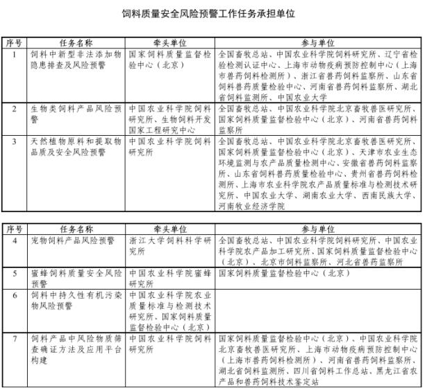 生產(chǎn)環(huán)節(jié)和互聯(lián)網(wǎng)銷售環(huán)節(jié)風險監(jiān)測工作由國家飼料質(zhì)量監(jiān)督檢驗中心(北京)承擔,經(jīng)營使用環(huán)節(jié)風險監(jiān)測工作由中國農(nóng)業(yè)科學院飼料研究所承擔,養(yǎng)殖環(huán)節(jié)自配料風險監(jiān)測工作由中國農(nóng)業(yè)科學院北京畜牧獸醫(yī)研究所承擔。