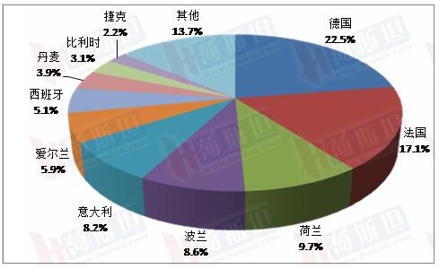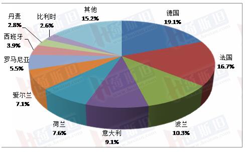 歐盟5個成員國牛奶產(chǎn)量超過1000萬噸,德國3254.9萬噸,同比增長0.3%,占?xì)W盟總產(chǎn)量的22.5%;法國2466.0萬噸,同比增長0.5%,占17.1%;荷蘭1396.0萬噸,同比增長1.1%,占9.7%;波蘭1245.7萬噸,同比增長2.3%,占8.6%;意大利1189.5萬噸,同比下降0.6%,占8.2%。