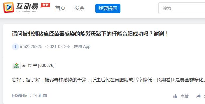 4月1日,新希望在互動平臺上表示,被弱毒株感染的母豬,所生后代在育肥期成活率偏低,長期看還是要全群凈化。