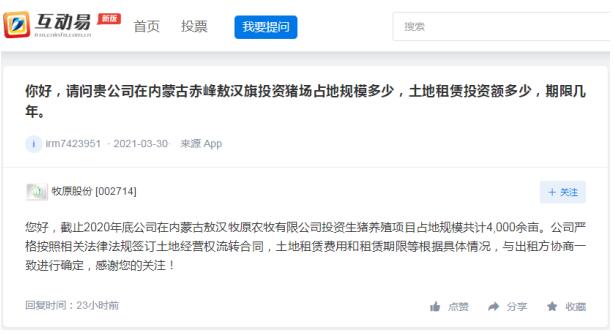 牧原股份4月1日在互動平臺上表示,截止2020年底公司在內(nèi)蒙古敖漢牧原農(nóng)牧有限公司投資生豬養(yǎng)殖項目占地規(guī)模共計4,000余畝。公司嚴(yán)格按照相關(guān)法律法規(guī)簽訂土地經(jīng)營權(quán)流轉(zhuǎn)合同,土地租賃費用和租賃期限等根據(jù)具體情況,與出租方協(xié)商一致進行確定。