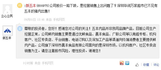 新五豐近日在互動(dòng)平臺(tái)上表示,五豐肉品并非我司品牌產(chǎn)品,目前公司生產(chǎn)經(jīng)營(yíng)正常,公司鮮肉銷售主要是通過優(yōu)鮮食品、晨豐食品、廣聯(lián)公司等以商超專柜、機(jī)構(gòu)客戶、社區(qū)專賣店、平臺(tái)銷售、電話訂購(gòu)以及深加工產(chǎn)品等渠道向終端消費(fèi)者主要提供鮮肉產(chǎn)品。公司旗下深圳市晨豐食品有限公司面向的是深圳市場(chǎng),以機(jī)構(gòu)客戶、社區(qū)專賣店銷售為主。