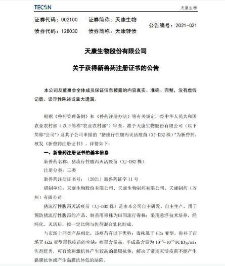天康生物4月12日公告,經(jīng)農(nóng)業(yè)農(nóng)村部審查,準予公司及其子公司申報的“豬流行性腹瀉滅活疫苗(XJ-DB2株)”為新獸藥,核發(fā)《新獸藥注冊證書》。